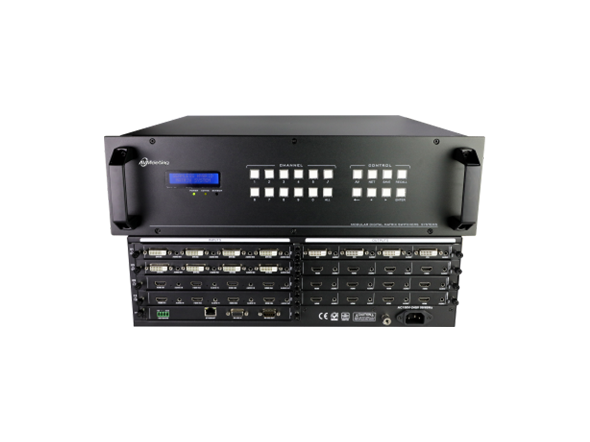 超高清插卡拼接矩阵是一款配置灵活的拼接与无缝矩阵信号切换器。采用高性能的FPGA纯硬件内核和模块化插卡设计,支持CVBS、SVIDEO、YPbPr、VGA、DVI、HDMI、DP、SDI、HDBaseT双绞线、光纤、KVM、IP编解码各类高清晰数字/模拟信号切换处理,并支持双向RS-232、双向IR信号分配切换功能。拼接功能是将一个完整的图像信号划分成多个信号,分配给多个显示单元,同时组成一个大的显示屏幕来显示动态画面。为各行业的多种视频及控制信号分配切换处理提供一站式解决方案,可广泛应用于广播电视工程、多媒体会议厅、大屏幕显示工程、电视教学、智能交通管理中心、指挥控制中心等场所。